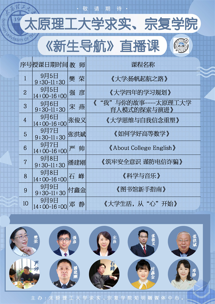 凝“新”聚力,筑梦起航。9月份,学院为进一步提高学生入学教育的效率,助力新生健康成长和全面发展,依托学院官方抖音平台开展了线上直播课程,邀请本科生院副院长(主持日常工作)、求实学院院长、宗复学院副院长宋燕教授,信息与计算机学院副院长强彦教授,马克思主义学院副院长张俊义,马克思主义学院樊荣教授,数学学院张洪斌教授,艺术学院副院长石峰教授,外国语学院严帅老师、图书馆知识产权信息服务部主任付鑫金、晋中公安局高校分局驻明向校区社区民警潘建刚、学生心理健康指导中心专职咨询师邓静等专家学者从大学规划、理想信念、高数、英语学习、心理健康、安全意识等方面开展线上直播课程,旨在顺利地帮助新生完成大学生身份的转变,积极思考人生、规划未来,学会系好人生第一粒“扣子”。