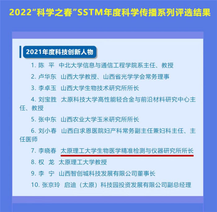 11月8日上午,山西科技传媒集团庆祝第23个中国记者节暨2022“科学之春”SSTM年度科学传播系列评选活动表彰大会在山西省科技馆隆重举行。该活动由山西省科协指导,山西科学传播年度评选活动组委会、山西科技新闻出版传媒集团主办,受到了社会各界广泛关注,线上累积浏览量达250万余次。经过公开推荐、初评、公众投票,并综合专家组终评意见,我校生物医学工程学院副院长李晓春教授被评选为“2021年度科技创新人物”,并颁发荣誉证书和奖杯。