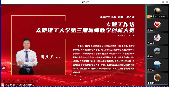 2月19日,本科生院教师发展中心举办线上“教学创新成果报告专题工作坊”活动,本科生院相关领导和我校入围省赛的教师团队等18人参加了线上交流探讨。本次工作坊特别邀请首届全国高校教师教学创新大赛一等奖获得者、西安交通大学周屈兰教授给老师们的教学创新成果报告做专项指导。