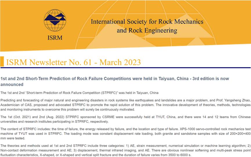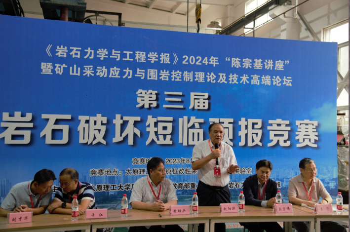 “岩石破坏短临预报”竞赛由中国科学院院士、我校赵阳升教授提出,现已作为“陈宗基讲座”的组成部分持续在我校举办。岩石与岩体系统的失稳破坏是人类重大自然灾害的核心科学问题,也是固体破坏中最为艰难的问题,而固体破坏被列为21世纪的重大科学难题。“岩石破坏短临预报”竞赛旨在通过竞赛的方式引导中国乃至全世界岩体力学与工程学者关注这一问题并激发创新灵感,使各国学者们认识到彼此在非线性岩体力学理论、方法、技术与监测仪器水平全方位的彼此差异与不足,进而推进对当前岩石工程领域中岩爆、煤与瓦斯突出、滑坡、地震等重大工程与自然灾害预报理论与实践能力。该竞赛自2021年创办以来,在国内外产生了重要影响。2023年3月国际岩石力学与工程学会(ISRM)在官网主页报道了前两届“岩石破坏短临预报竞赛”(详情请点击链接:https://isrm.net/newsletter/show/240#short-term-prediction-of-rock-failure-competitions-held-in-taiyuan-china)。这是国内岩石力学领域竞赛事项首次出现在该领域国际学会主页,并引起了国际同行的密切关注。