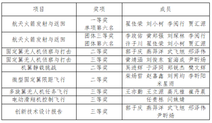 大赛共设有3个大类9个项目,包括限重定点空投、限时载运飞行、太阳能飞机任务飞行、固定翼无人机侦察与打击、微型固定翼限距飞行、多旋翼无人机任务飞行、航天火箭发射与返回等7个飞行挑战项目,以及机翼静载挑战工程验证项目和创新技术设计报告项目。我校参加了除太阳能飞机任务飞行以外的8个项目,共获得了一等奖1项、二等奖3项、三等奖5项、单项第六名1项、团体第六名1项、优秀团队奖及优秀指导教师奖等13个奖项。