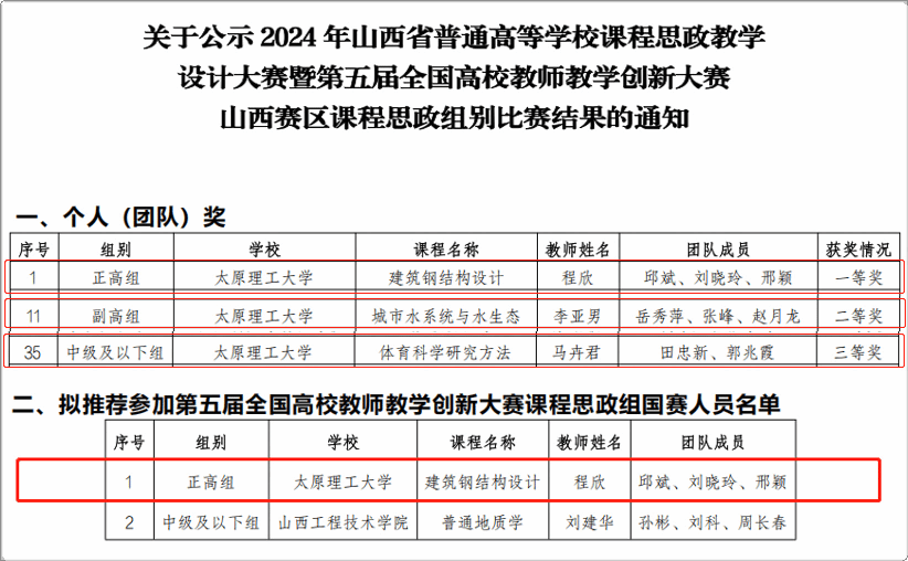 11月24日,“2024年山西省普通高等学校课程思政教学设计大赛暨第五届全国高校教师教学创新大赛山西赛区课程思政组比赛”在中北大学圆满落幕。经过激烈角逐,我校土木工程学院程欣、李亚男,体育与健康工程学院马卉君三个教师团队分别获正高组一等奖、副高组二等奖、中级及以下组三等奖,其中,程欣教师团队以省赛第一名的成绩晋级第五届全国高校教师教学创新大赛课程思政组国赛。