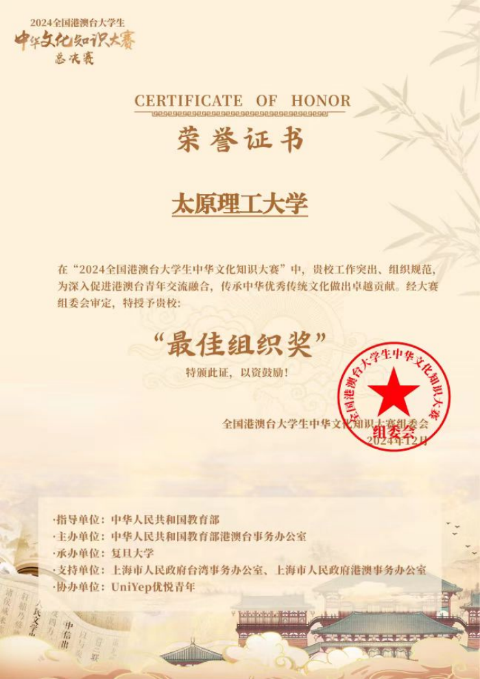 近日,由教育部港澳台事务办公室主办的2024全国港澳台大学生中华文化知识大赛在上海复旦大学圆满落幕。我校首次参加该赛事,表现出色,获得了最佳组织奖、最佳指导教师奖等多个奖项。