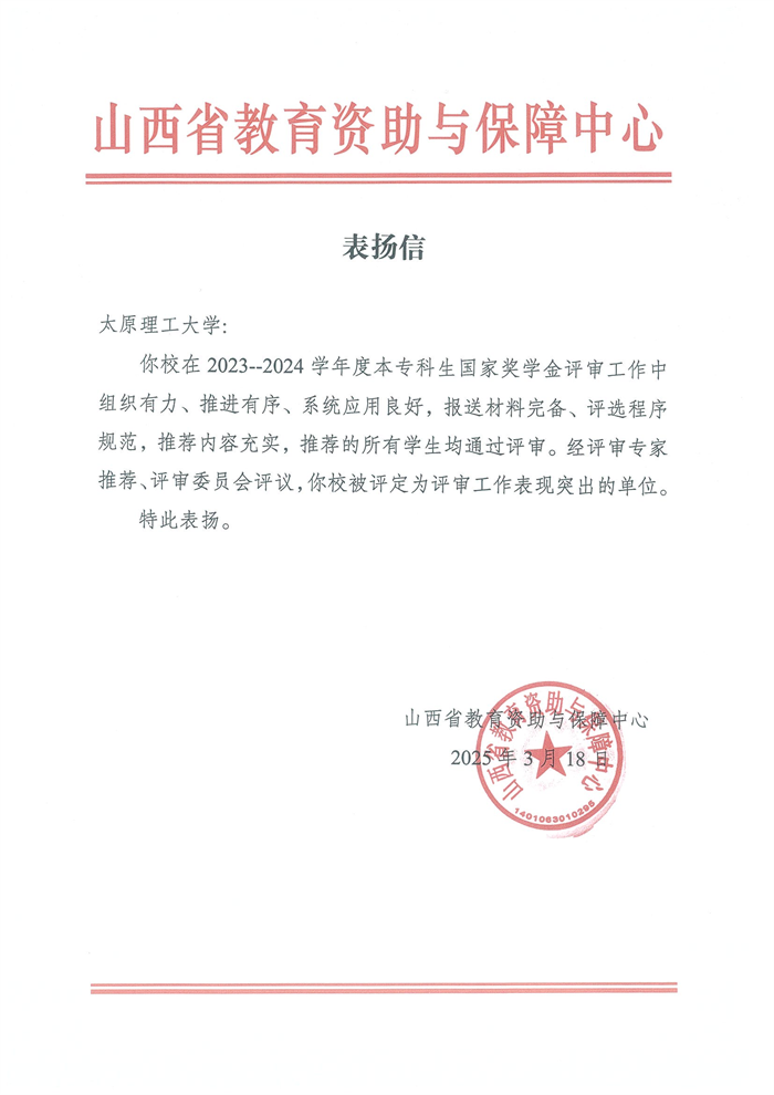 在2023-2024学年国家奖学金评审工作中,我校凭借严谨规范地工作管理、公平公正地评审组织以及精准高效的数据填报等,得到山西省教育资助与保障中心高度认可,受到通报表扬,被评为“国家奖学金评审工作表现突出单位”。