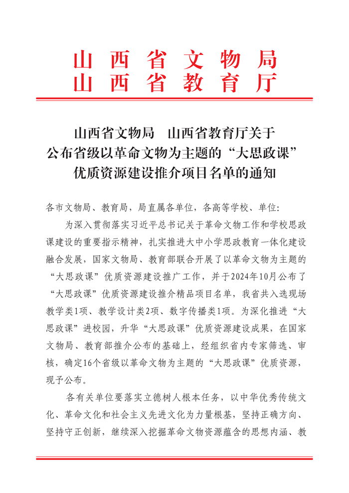 通知指出,为深入贯彻落实习近平总书记关于革命文物工作和学校思政课建设的重要指示精神,扎实推进大中小学思政教育一体化建设融合发展,深化推进“大思政课”进校园,升华“大思政课”优质资源建设成果,在国家文物局、教育部推介公布的基础上,经组织山西省内专家筛选、审核,确定了16个省级以革命文物为主题的“大思政课”优质资源。