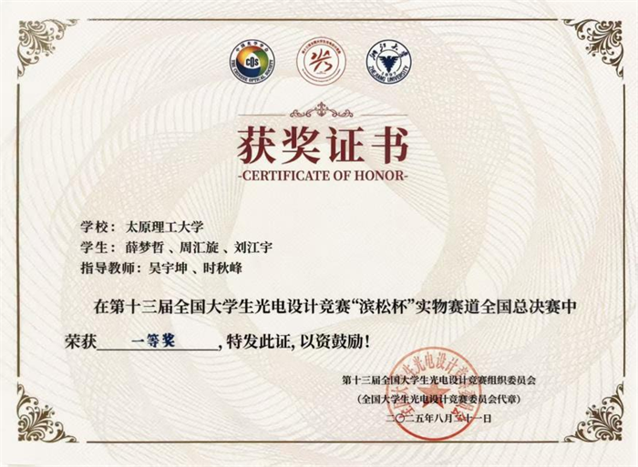 8月22日,第十三届全国大学生光电设计竞赛决赛在浙江大学紫金港校区落下帷幕。我校物理与光电工程学院的“越测越精”队薛梦哲、刘江宇、周汇旋3名同学,在团队指导老师吴宇坤老师和时秋峰老师的指导下,凭借出色的创新设计和稳定的临场发挥,从众多顶尖队伍中脱颖而出,一举夺得全国一等奖的骄人成绩。