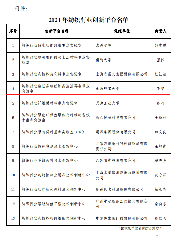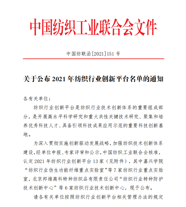 11月24日,中国纺织工业联合会正式下达了《关于公布2021年纺织行业创新平台名单的通知》,我校轻纺工程学院“纺织行业废旧涤棉纺织品清洁再生重点实验室”成功获批,标志着我国废旧纺织品循环利用领域第一个行业重点实验室诞生,同时轻纺工程学院在省部级科研平台建设方面也取得零的突破。