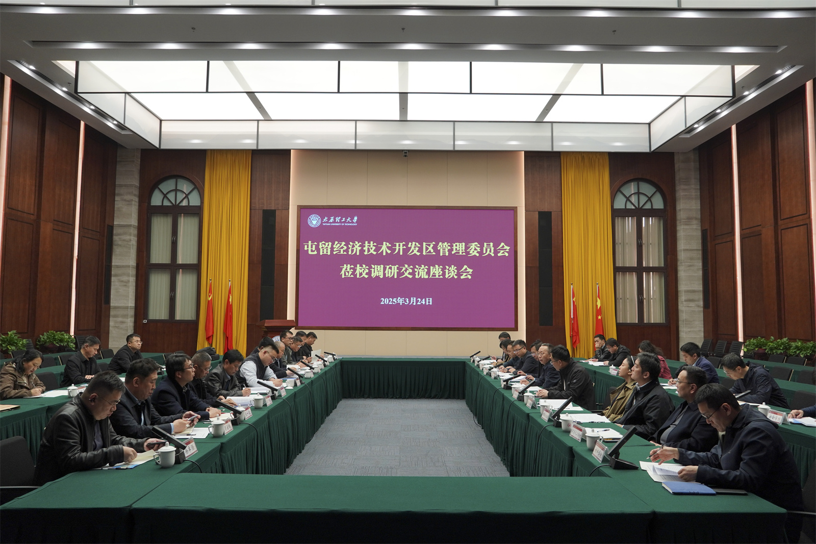 3月24日,屯留经济技术开发区管理委员会主任王志坚一行莅临我校调研,并在鹏飞会堂座谈交流。校党委书记沈兴全会见了王志坚一行,校党委常委、副校长任喜莹出席座谈会,屯留经济技术开发区相关人员、10余家相关企业负责人,我校相关部门(单位)负责人参加座谈。