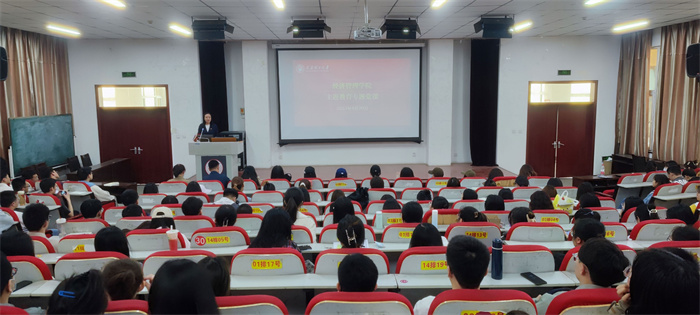 4月20日中午,经济管理学院在学院报告厅为全院学生党员讲授学习贯彻习近平新时代中国特色社会主义思想主题教育专题党课,院党委书记闫新主讲,学院全体学生党支部书记一同聆听了党课。