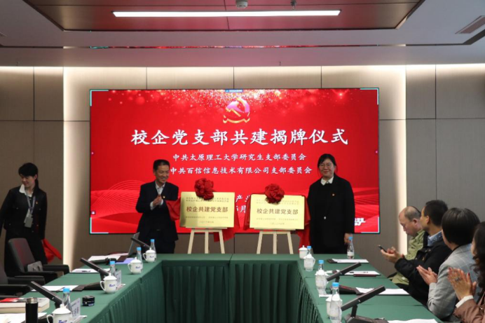 软件学院研究生党支部与百信党支部举行了校企共建党支部挂牌仪式,通过党建共建的合作,建立起常态化沟通协商机制、工作通报机制和业务互促机制,实现党建品牌创建与产教融合工作的有机融合,以高质量党建推动学校、企业的高质量发展。