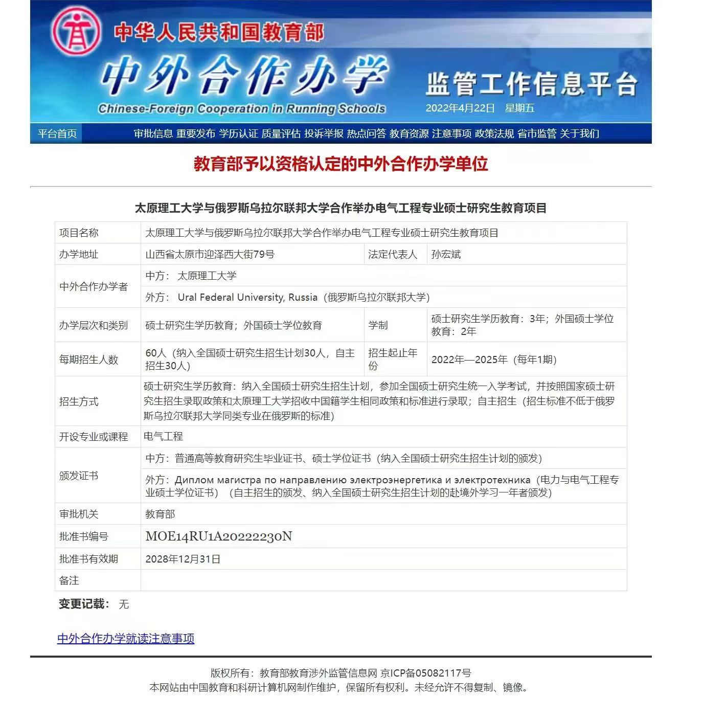 近日,我校申报的与俄罗斯乌拉尔联邦大学合作举办电气工程专业硕士研究生教育项目获教育部正式批准。