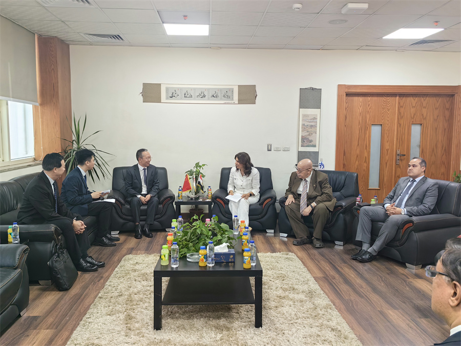7月12日,代表团抵达埃及,拜访了中国驻埃及大使馆,与公参卢春生举行工作会谈。任喜莹向卢春生详细介绍了我校近年来与埃及高校的交流合作情况,并对使馆长期以来对我校与埃及交流工作给予的大力支持表示感谢。任喜莹特别提到,埃及是“一带一路”沿线重要国家,我校高度重视与埃及高校的合作,此次出访旨在落实两国领导人共识,深入推进人才培养、科研攻关、技术转移等领域的务实合作,共同服务两国经济社会发展需求,为深化中埃全面战略伙伴关系贡献力量。卢春生对我校积极拓展与埃及教育合作的务实行动表示肯定。他详细介绍了埃及当前经济社会和教育科技发展情况,表示使馆将支持我校与埃及教育机构深入开展交流合作。