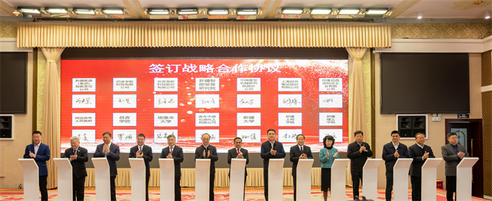 郑强书记代表学校分别与凯赛尔·阿不都克热木副主席、吴红展书记签署共建协议;中国工程院院士、新疆智能装备研究院首任院长、我校黄庆学教授与自治区相关企业、高校签订合作协议;艾尔肯·吐尼亚孜主席与中国工程院院士、我校金智新教授共同为新疆智能装备研究院揭牌。