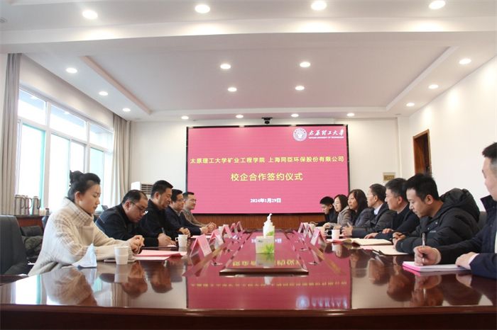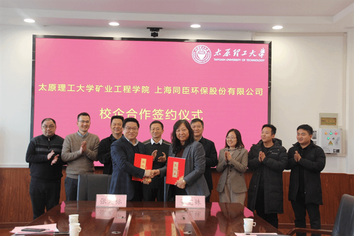 1月29日,我校矿业工程学院与上海同臣环保有限公司校企合作签约仪式在虎峪校区致明楼318会议室举行。太原同创谷负责人、同济大学校友会副会长雷志彬应邀出席仪式,上海同臣环保股份有限公司董事长张文标,研发总监宋玉,煤炭事业部总监王龙丰;我校党委常委、副校长肖连团,矿业工程学院党委书记巴大志,院长董宪姝出席签约仪式。太原同创谷相关部门负责人及矿业工程学院教师代表等参加仪式。仪式由巴大志主持。