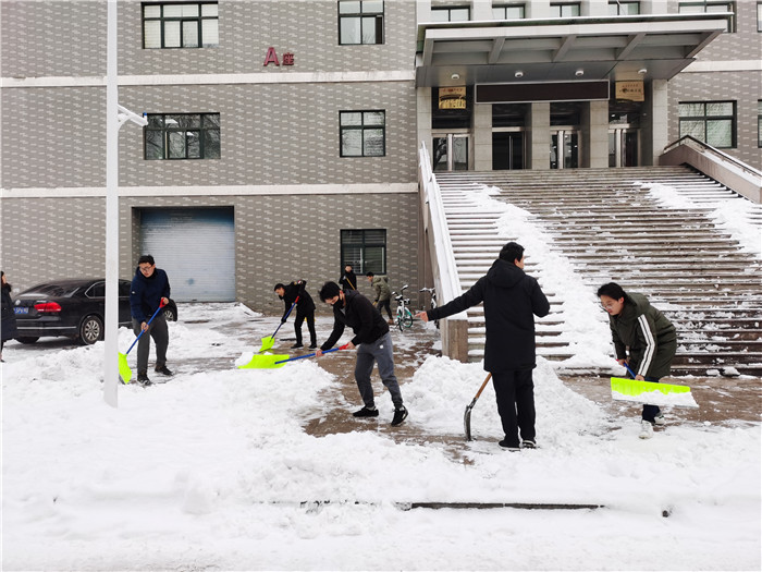 1月5日,太原市迎来了近几年的一次大范围降雪,校园内被积雪覆盖,银装素裹,分外妖娆。虽说瑞雪兆丰年,但积雪路面给大家的出行带来了诸多不便。为方便师生出行,1月6日上午,土木工程学院组织学生党员对博学楼前区域的路面进行扫雪铲冰。