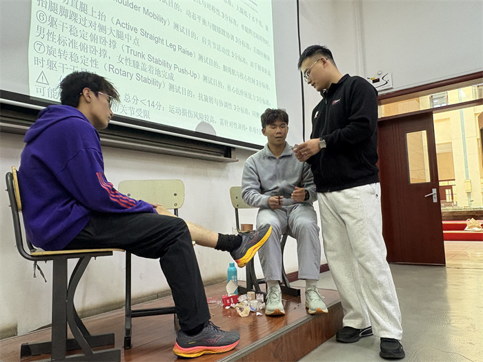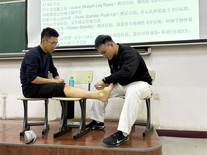 讲座尾声,同学们围绕日常训练中遇到的肌肉拉伤、关节损伤等实际问题,向两位专家请教解决方案。人工智能学院肖玺耀同学在交流中表示:“这次培训不仅让我系统掌握了运动急救与康复的专业知识技能,更在实操过程中提升了劳动动手能力,培养了严谨认真的劳动态度。”