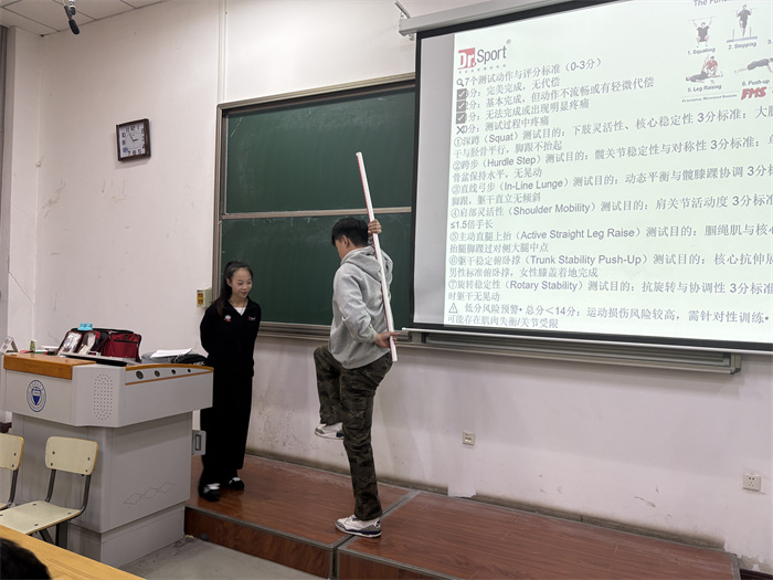 理论讲解结束后,靳文卓治疗师带领学生进入实践互动环节,将劳动技能培训落到实处。他先是规范演示了功能性动作筛查(FMS)中的7个核心测试动作,动作标准、讲解通俗,让学生快速理解动作要领;随后聚焦实用急救技能,现场教学崴脚后的应急绷带包扎方法及运动前关键部位(脚踝、手腕等)的防护包扎技巧,并细致演示肌内效贴的裁剪与粘贴方法。学生积极参与实操练习,主动配合演示的同学还获得了定制小礼品,现场互动氛围热烈,将活动推向高潮。