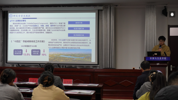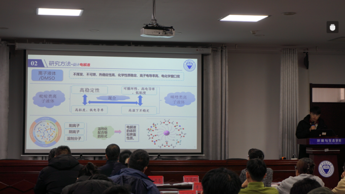 随后,三位研究生代表作学术分享。南京联培研究生冯泳宏以《新能源在污水处理领域的应用实践与学习总结》为题,结合学习与工程实践经历,分享新能源技术在污水处理场景中的应用思考与实践体会。南京联培研究生董靖恺围绕《RTO领域联培实践工作成果》作报告,聚焦VOCs治理中的RTO应用实践与科研推进,并介绍阶段性成果与下一步计划。国家奖学金获得者曹志会以《二维限域通道锂离子特殊脱溶剂化赋能宽温域电池》为题进行分享,展示其在环境与能源新材料方向的研究进展与探索。